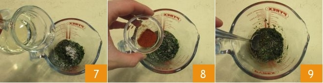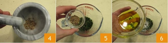 um sie zu Pulver zu verarbeiten 4. In einem Krug geben Sie die gehackten Kräuter und die gemahlenen Gewürze 5, fügen Sie das Olivenöl hinzu 6