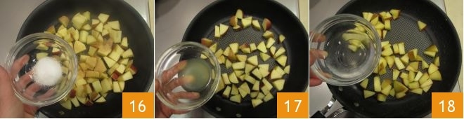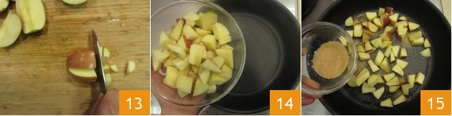 und dann in Viertel und schließlich in kleinere unregelmäßige Stücke 13. Geben Sie die Apfelstücke in eine Pfanne 14, fügen Sie den braunen Zucker hinzu 15,