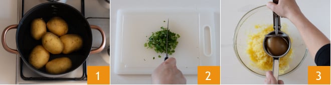 Um die im Ofen gebackenen Kartoffelbällchen zuzubereiten, kochen Sie zuerst die Kartoffeln 30-40 Minuten lang 1 oder bis sie weich sind; überprüfen Sie den Garzustand mit einer Gabel: Wenn Sie leicht in die Mitte der Kartoffeln eindringen können, sind sie fertig. Hacken Sie die Petersilie, nachdem Sie sie gewaschen und getrocknet haben 2. Pressen Sie die noch heißen Kartoffeln mit Schale durch eine Kartoffelpresse (oder schälen Sie sie und zerdrücken Sie sie mit einer Gabel) und sammeln Sie das Püree in einer Schüssel 3.