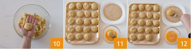 Jetzt formen Sie Bällchen, indem Sie diese leicht mit den Händen plattdrücken 10 und legen Sie auf ein Tablett. Bereiten Sie die Panade vor: Schlagen Sie die Eier in einer Schüssel, geben Sie in einen anderen Teller das Paniermehl. Dann nehmen Sie die Bällchen, tauchen sie in das Ei 11 und dann in das Paniermehl 12.