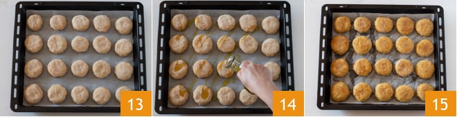 Legen Sie alle Bällchen auf ein mit Backpapier ausgelegtes Backblech 13, beträufeln Sie sie mit 2 Esslöffeln Öl 14 und backen Sie sie im vorgeheizten Ofen bei 180°C für 15 Minuten oder bis sie goldbraun sind. Nach der Backzeit nehmen Sie die im Ofen gebackenen Kartoffelbällchen heraus 15 und servieren Sie sie heiß!