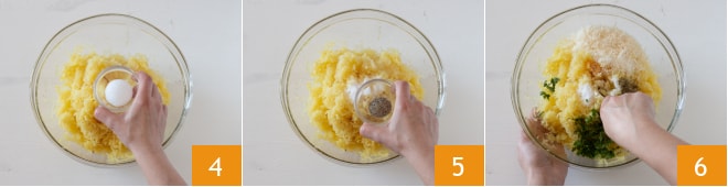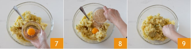 Vermengen Sie alles gut, dann geben Sie das Ei 7 und das Paniermehl 8 hinzu. Rühren Sie, um eine homogene Masse zu erhalten 9.