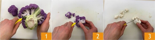 Um die Wolfsbarschfilets im Ofen zuzubereiten, waschen Sie zuerst das Gemüse. Beginnen Sie dann mit dem violetten Blumenkohl, trennen Sie die Röschen 1 und teilen Sie sie in kleinere Röschen 2. Machen Sie dasselbe mit dem weißen Blumenkohl 3.