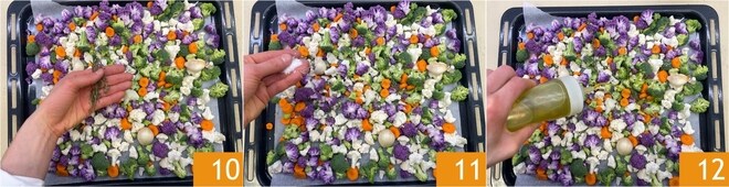 Fügen Sie den Zitronenthymian 10, das Salz 11, den Pfeffer und einen Schuss Öl 12 hinzu. Massieren Sie das Gemüse, um das Gewürz gleichmäßig zu verteilen, und backen Sie es im vorgeheizten statischen Ofen bei 180° für 20 Minuten.