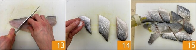 In der Zwischenzeit kümmern Sie sich um die Wolfsbarschfilets. Stellen Sie sicher, dass keine Gräten vorhanden sind, und entfernen Sie sie gegebenenfalls mit einer Pinzette. Schneiden Sie dann jedes Filet in 3 Stücke, indem Sie einen schrägen Schnitt 13 machen. Salzen Sie den Wolfsbarsch 14 und würzen Sie ihn mit dem Öl 15. Massieren Sie, um das Gewürz gleichmäßig zu verteilen.