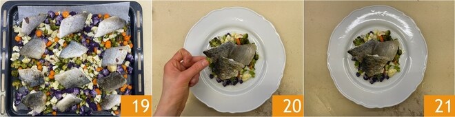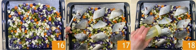 Wenn das Gemüse weich ist, nehmen Sie es aus dem Ofen 16. Legen Sie die Wolfsbarschfilets darüber, mit der Hautseite nach oben, und legen Sie auf jedes Stück ein Stückchen Sardelle 17. Würzen Sie erneut mit einem Schuss Öl 18.