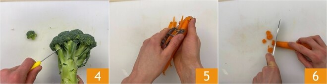 Entfernen Sie dann auch die Röschen vom Brokkoli 4. Gehen Sie zu den Karotten, schälen Sie sie 5 und schneiden Sie sie in Scheiben 6.