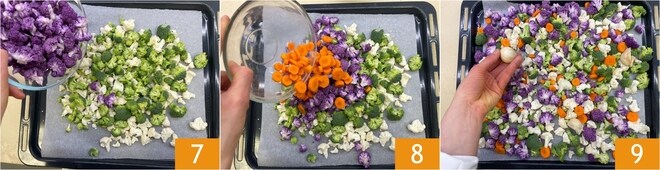 In einer mit Backpapier ausgelegten Backform die Brokkoli und Blumenkohlröschen 7 geben; fügen Sie auch die Karotten 8 und die 3 Knoblauchzehen in der Schale 9 hinzu.