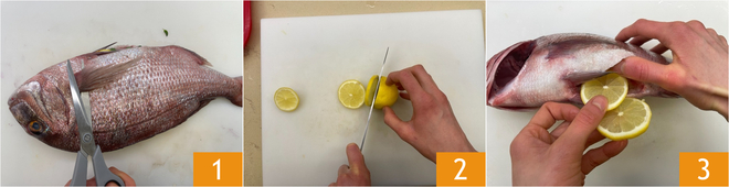 Um den im Ofen gebackenen Dentex mit Kartoffeln zuzubereiten, beginnen Sie mit der Reinigung des Fisches: entfernen Sie die Eingeweide und schneiden Sie die Flossen ab, lassen Sie dabei jedoch die Schuppen dran 1. Schneiden Sie die Zitrone in Scheiben von 1 cm 2 und stecken Sie ein paar davon in den Bauch des Dentex 3.