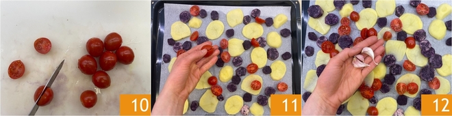 Schneiden Sie die Kirschtomaten halb 10 und verteilen Sie sie zusammen mit den Kartoffeln in der Auflaufform 11. Fügen Sie 2 Knoblauchzehen hinzu 12.