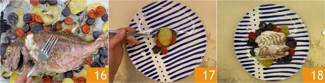 Nach Ende der Garzeit nehmen Sie die Form aus dem Ofen und entfernen mit Hilfe einer Gabel die Haut des Dentex 16. Richtet das Gemüse an 17 und legen Sie die Fischfilets darauf. Ihr im Ofen gebackener Dentex mit Kartoffeln ist nun servierbereit 18!