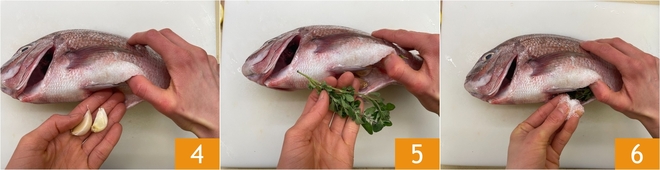 Fügen Sie auch die Knoblauchzehen hinzu 4, den frischen Majoran 5 und würzen Sie das Innere mit Salz 6.