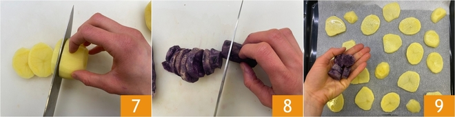 Kümmern Sie sich jetzt um die gelben und violetten Kartoffeln: schälen Sie sie und schneiden Sie die gelben Kartoffeln in Scheiben von etwa 4 mm 7, die violetten Kartoffeln hingegen in Würfel von 1 cm 8. Verteilen Sie sie mit Abstand zueinander in der Auflaufform 9.