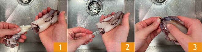 Um die im Ofen gratinierten Kalamare mit Kirschtomaten und Oliven zuzubereiten, beginnen Sie mit der Wie man Tintenfische putzt: Trennen Sie die Tentakel vom Mantel 1 und entfernen Sie die innen liegende Knorpelfeder 2. Spülen Sie alles unter fließendem Wasser ab und verwenden Sie Ihre Hände, um die Eingeweide im Mantel zu entfernen. Schneiden Sie mit einem kleinen Messer den unteren Teil des Mantels ein und entfernen Sie die äußere Haut 3.