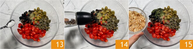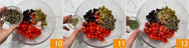 Fügen Sie auch die entsalzten Kapern 10, den getrockneten Oregano 11 und den getrockneten Schnittlauch 12 hinzu.