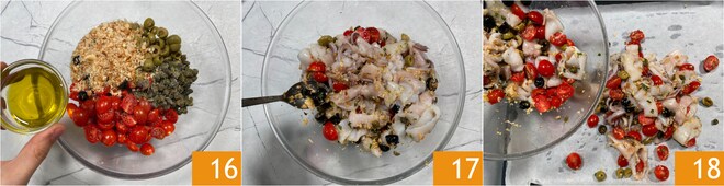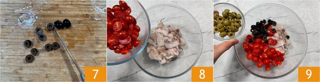 Machen Sie dasselbe mit den schwarzen Oliven 7. Geben Sie die Kirschtomaten in die Schüssel mit den Kalamaren 8, zusammen mit den schwarzen und grünen Oliven 9.
