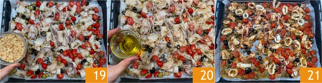Streuen Sie nun das restliche Paniermehl 19 und die restlichen 10 g Öl 20 darüber. Backen Sie im statischen Ofen bei 200° für 10 Minuten, dann wechseln Sie in den Umluftmodus, ebenfalls bei 200°, für weitere 15 Minuten. Ihre im Ofen gratinierten Kalamare mit Kirschtomaten und Oliven sind servierbereit 21!