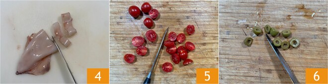 Schneiden Sie den Mantel in ca. 2 cm dicke Ringe 4. Trennen Sie dann das Auge von den Tentakeln und legen Sie letztere zusammen mit den Tintenfischringen in eine Schüssel. Jetzt halbieren Sie die Kirschtomaten 5 und die grünen Oliven 6.