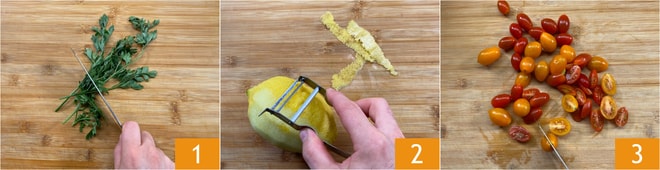 Um die Doradenfilets in der Pfanne zuzubereiten, hacken Sie die Petersilie 1 und bewahren Sie die Stiele auf, schälen Sie die Zitrone, um die Schale zu gewinnen 2, waschen Sie schließlich die Datterini und halbieren Sie sie 3.