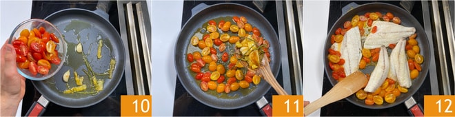 In der Bratflüssigkeit können Sie die Tomaten hinzufügen 10. Braten Sie sie etwa 10 Minuten, oder bis das Fruchtfleisch weich ist. Entfernen Sie dann die Schalen, den Knoblauch und die Petersilienstiele 11. Passen Sie das Salz an, fügen Sie die Doradenfilets hinzu und lassen Sie sie weitere 2 Minuten garen, um Geschmack anzunehmen 12.