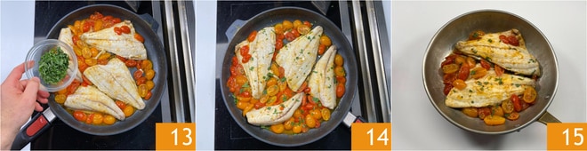 Wenden Sie sie vorsichtig und servieren Sie sie mit gehackter Petersilie 13. Die Doradenfilets in der Pfanne sind fertig 14, servieren Sie sie gut heiß 15.
