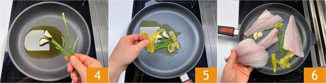 Erhitzen Sie in einer sehr großen Pfanne bei niedriger Hitze für 5 Minuten das Öl mit den Knoblauchzehen, den Petersilienstielen 4 und den Zitronenschalen 5. Nach Ablauf der Zeit erhöhen Sie die Hitze ein wenig und legen Sie die Doradenfilets mit der Hautseite nach unten 6.