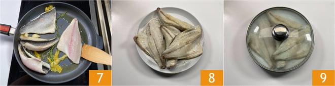 Sobald sie ihre Farbe ändern, nach etwa 2 Minuten, drehen Sie sie um und setzen Sie das Garen für weitere 2 Minuten fort 7. Wenn sie fertig sind, legen Sie sie auf einen Teller 8 und decken Sie sie 9.