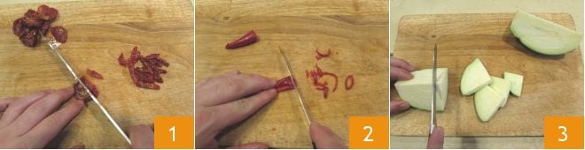 Um den Nudelsalat mit Auberginen und getrockneten Tomaten zuzubereiten, beginnen Sie damit, die getrockneten Tomaten in dünne Streifen zu schneiden 1. Entfernen Sie dann die Samen der frischen Chili und schneiden Sie auch diese in sehr feine Streifen 2. Schneiden Sie dann die Aubergine in 4 Stücke und jedes Stück in Scheiben von 3-4 mm 3.