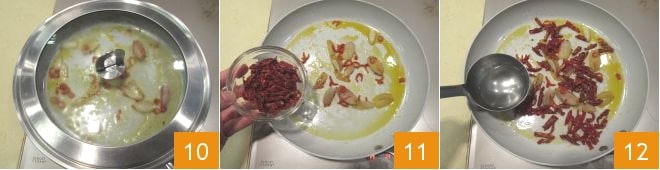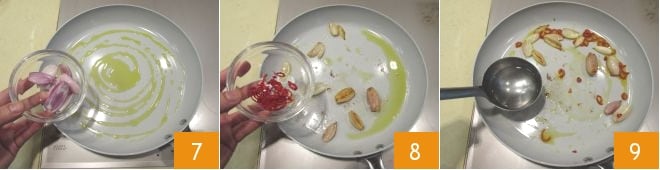 Während die Pasta kocht, braten Sie die in grobe Stücke geschnittene Schalotte in einer Pfanne an, in der Sie das Öl bei starker Hitze erhitzt haben 7, fügen Sie dann die Chili hinzu 8 und geben Sie eine Kelle Nudelkochwasser hinzu 9.