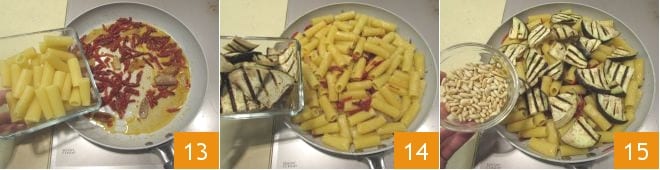 Die Pasta al dente abgießen und zur Sauce in die Pfanne geben 13. Fügen Sie auch die Auberginen 14 und die gerösteten Pinienkerne hinzu 15.