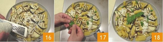 Schwenken Sie die Pasta für ein paar Minuten, streuen Sie dann den geriebenen gesalzenen Ricotta darüber 16, fügen Sie das grob mit der Hand zerrissene Basilikum hinzu 17 und servieren Sie Ihren Nudelsalat mit Auberginen und getrockneten Tomaten warm oder kalt, je nach Geschmack 18!