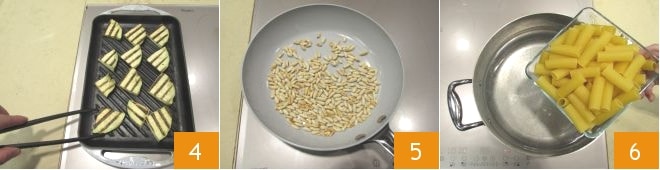 Grillen Sie die Auberginenscheiben auf dem heißen Grill, etwa 2 Minuten pro Seite 4. Rösten Sie dann die Pinienkerne in einer beschichteten Pfanne für 3-4 Minuten, und achten Sie darauf, sie nicht zu verbrennen 5. Geben Sie die Rigatoni in kochendes Salzwasser 6.