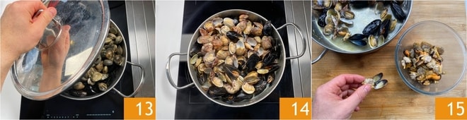 Decken Sie mit einem Deckel ab 13 und lassen Sie sie 3-4 Minuten kochen, bis sie sich öffnen 14. Am Ende entfernen Sie die Schalen der Weichtiere 15 und bewahren Sie die Garflüssigkeit auf.