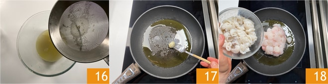 Filtern Sie die Flüssigkeit durch ein Sieb und legen Sie sie beiseite 16. In einer Pfanne erhitzen Sie etwas Öl mit der anderen Knoblauchzehe 17, fügen Sie die Seeteufel-Stücke und die Sepien hinzu 18.