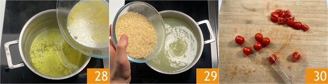 Im Topf, in dem Sie die Petersilienblätter blanchiert haben, fügen Sie die Garflüssigkeit der Muscheln und Venusmuscheln hinzu 28 und bringen Sie sie zum Kochen, dann kochen Sie den Reis 8 Minuten lang 29. Waschen Sie die Kirschtomaten und vierteln Sie sie 30.