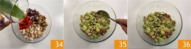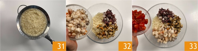 Den Reis abtropfen lassen 31 und abkühlen lassen. Zu diesem Zeitpunkt geben Sie den Reis in eine große Schüssel, fügen Sie die Fische und Meeresfrüchte hinzu 32 und fügen Sie auch die Kirschtomaten hinzu 33.