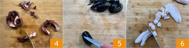 Schneiden Sie den Oktopus in Stücke von etwa 1,5 cm 4 und legen Sie sie beiseite. In der Zwischenzeit Wie man Miesmuscheln reinigt und öffnet, indem Sie das Byssus und die Verunreinigungen an der Oberfläche mit einem Messer entfernen 5. Reinigen Sie das Fleisch des Seeteufels, indem Sie den zentralen Knochen entfernen und ihn dann in Stücke von 1,5 cm zerkleinern 6.