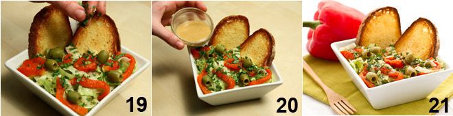 die grünen Oliven 18, das gehackte Sellerieblatt 19 und geben Sie das restliche Dressing obenauf 20. Servieren Sie den Sellerie- und Paprikasalat mit den gerösteten Brotscheiben 21.