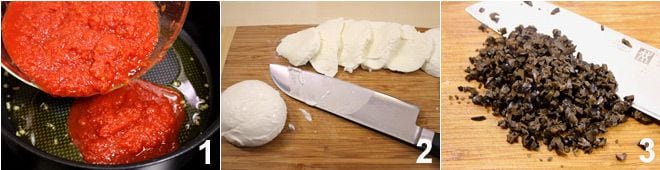 Um die Rouladen nach Pizzaiola-Art zuzubereiten, beginnen Sie damit, die zerdrückte Knoblauchzehe in einem großen Topf mit dem Öl zu erhitzen. Lassen Sie den Knoblauch goldbraun werden und fügen Sie dann die Tomatenpassata hinzu 1, lassen Sie sie mit Salz und Pfeffer abschmecken. Zum Schluss Oregano und Petersilie hinzufügen. Während die Sauce kocht, klopfen Sie die Fleischscheiben leicht mit einem Fleischklopfer, schneiden Sie sie gleichmäßig, falls sie sehr unregelmäßig sein sollten. Schneiden Sie den Mozzarella (oder Scamorza) in dünne Scheiben 2 und lassen Sie ihn in einem Sieb abtropfen, damit er so viel Wasser wie möglich verliert. Hacken Sie die schwarzen Oliven fein 3.