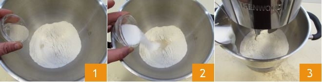 Um die Iris zuzubereiten, beginnen Sie mit der Herstellung des Teigs. Geben Sie das gesiebte Mehl in die Schüssel der Küchenmaschine, zusammen mit der Hefe 1, fügen Sie dann den Zucker hinzu 2, schalten Sie die Maschine bei mittlerer Geschwindigkeit mit dem montierten Haken ein und beginnen Sie, die lauwarme Milch langsam zu gießen 3.