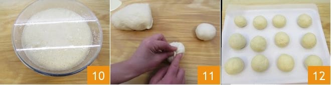 Nach den 4 Stunden hat sich der Teig verdoppelt 10, nehmen Sie ihn also wieder und teilen Sie ihn in 12 Stücke von jeweils etwa 80 Gramm, indem Sie ihn mit den Händen auf der Arbeitsfläche in einer kreisförmigen Bewegung zu Kugeln formen 11; legen Sie sie auf ein mit Backpapier ausgelegtes Tablett 12 und lassen Sie sie noch eine Stunde zugedeckt mit einem sauberen Tuch gehen.