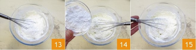 Bereiten Sie in der Zwischenzeit die Füllung Ihrer Iris vor. Sieben Sie die Ricotta, fügen Sie den Puderzucker hinzu und mischen Sie vorsichtig mit dem Schneebesen 13; teilen Sie die Mischung dann auf zwei Schüsseln auf. In eine Schüssel geben Sie die zusätzliche Menge an Ricotta und Puderzucker (wie für die klassische Füllung angegeben) 14. Für die andere Schüssel, die die Basis für die Füllung mit Schokoladentropfen sein wird, muss nichts weiter hinzugefügt werden 15.
