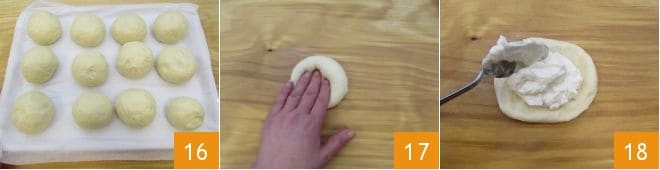Nehmen Sie die inzwischen aufgegangenen Kugeln 16 und drücken Sie sie mit den Fingern flach, um Kreise zu formen 17; geben Sie einen großzügigen Löffel der klassischen Füllung in die Mitte von 6 dieser Kreise 18.