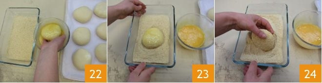 Tauchen Sie Ihre Iris nun vorsichtig zuerst in die leicht geschlagenen Eier 22 und dann in die Semmelbrösel (23-24).