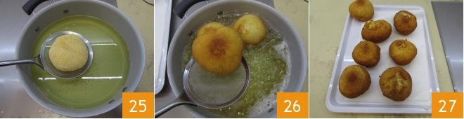 In einem großen Topf das Pflanzenöl auf 170° erhitzen (Sie können die Temperatur mit einem Küchenthermometer messen); frittieren Sie die Iris, höchstens 2 gleichzeitig, 25 etwa 5-6 Minuten lang, indem Sie sie zur Hälfte der Garzeit drehen, um beide Seiten gut zu bräunen 26. Legen Sie sie dann auf ein mit Küchenpapier ausgelegtes Tablett, um das überschüssige Öl zu entfernen 27. Servieren Sie Ihre Iris noch heiß!