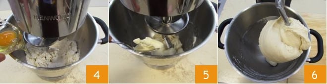 Fügen Sie auch das Ei hinzu 4 und kneten Sie den Teig etwa 10 Minuten lang, geben Sie dann die Butter bei Zimmertemperatur nach und nach hinzu, warten Sie, bis ein Stück aufgenommen ist, bevor Sie mit dem nächsten fortfahren 5, und kneten Sie, bis sich der Teig von den Wänden der Schüssel der Küchenmaschine löst und sich am Haken umwickelt 6.