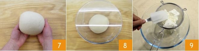 Geben Sie den Teig nun auf eine Arbeitsfläche und formen Sie ihn mit den Händen zu einer Kugel 7. Legen Sie ihn dann in einen Behälter, bedecken Sie ihn mit Frischhaltefolie 8 und lassen Sie ihn mindestens 4 Stunden lang im ausgeschalteten Ofen mit eingeschaltetem Licht gehen (bei einer Temperatur zwischen 26-30° maximal). In der Zwischenzeit geben Sie die Ricotta in ein Sieb und legen Sie sie 3-4 Stunden lang in den Kühlschrank, um die überschüssige Flüssigkeit zu verlieren 9. Wenn Sie die Version mit Schokoladentropfen zubereiten möchten, geben Sie diese in eine kleine Schüssel und frieren Sie sie mindestens 30 Minuten lang ein, damit sie beim Kochen nicht schmelzen.