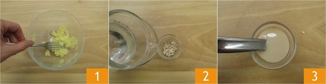Um is coccois prenas zuzubereiten, blanchieren Sie zunächst die Kartoffeln (die für den Teig benötigt werden) für etwa 40 Minuten, bis sie weich sind. Sobald sie gekocht sind, gießen Sie sie ab und zerdrücken 40 g davon 1. Jetzt geben Sie die Hefe in eine Schüssel, fügen einen Teil des Wassers hinzu 2 und rühren gut um, bis die Hefe sich aufgelöst hat 3.
