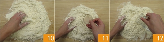 Beginnen Sie nun, den Teig mit den Händen zu kneten 10 und fügen Sie ebenfalls das Wasser hinzu, in dem Sie die Hefe aufgelöst haben 11. Geben Sie dann langsam auch das restliche Wasser hinzu 12.