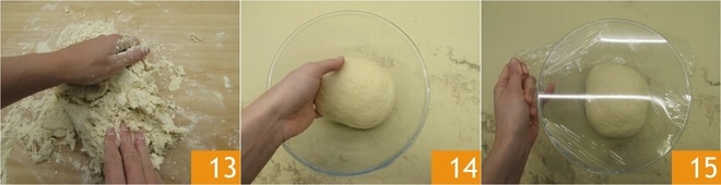 Sie müssen den Teig etwa 5 Minuten lang kneten 13, bis er glatt ist. Dann legen Sie ihn in eine Schüssel 14, decken ihn mit Frischhaltefolie ab 15 und lassen ihn 20-24 Stunden bei Raumtemperatur gehen. Nach dieser Zeit transferieren Sie den Teig in den Kühlschrank und lassen ihn 2 Tage reifen.